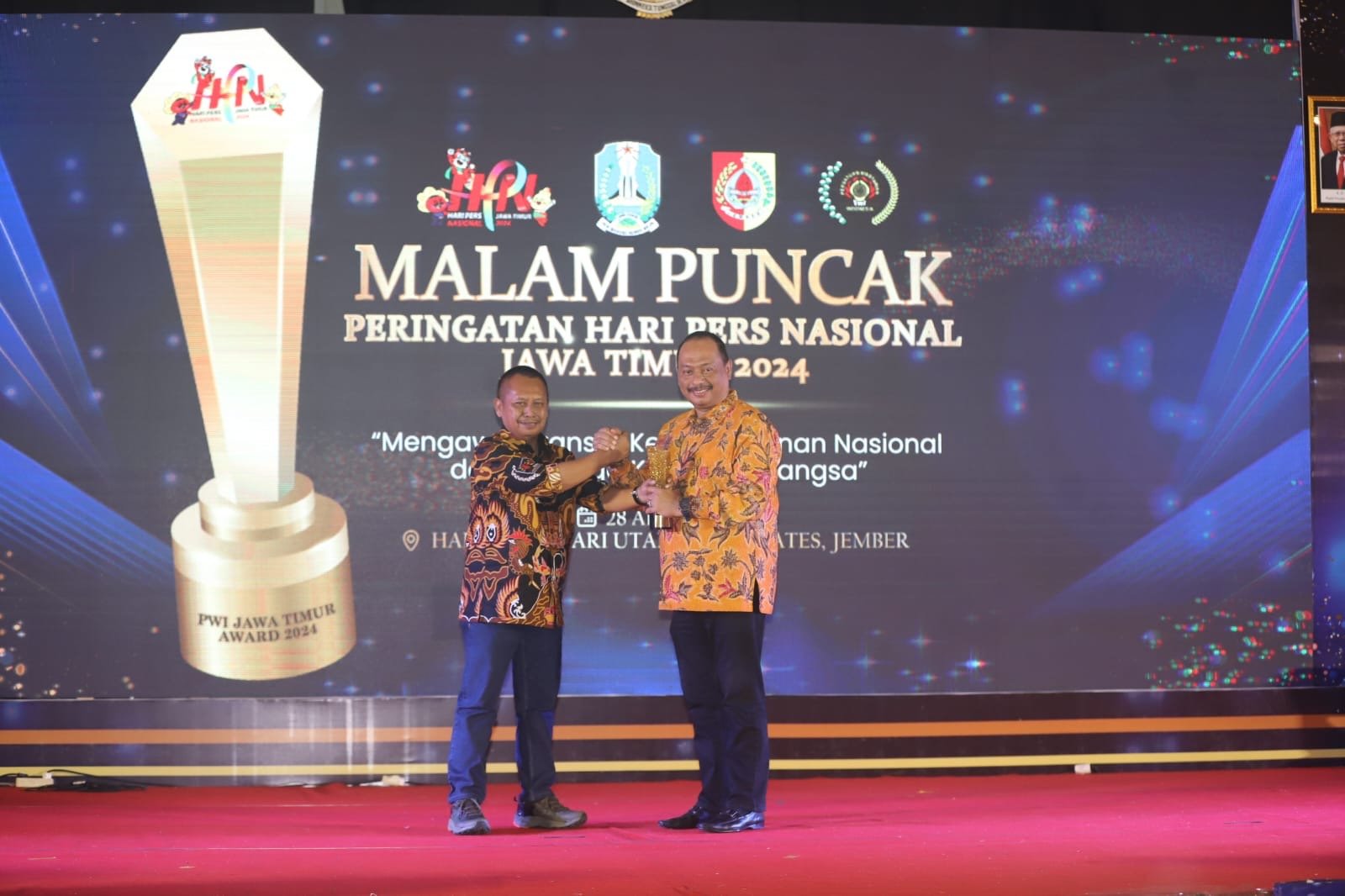 Penghargan tersebut, diserahkan langsung oleh Ketua PWI Jatim, Lutfil Hakim pada acara yang dihadiri oleh Pj Gubernur Jatim Adhy Karyono, Bupati Jember Hendy Siswanto dan beberapa pejabat lainnya.