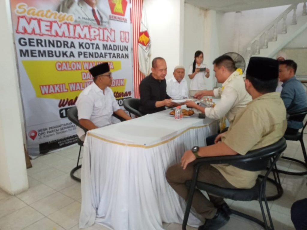 Pengembalian berkas formulir pendaftaran diterima langsung Ketua DPC Partai Gerindra Kota Madiun, Bambang Wahyudi, S.T., didampingi sekretaris partai, Eko Andi Siswantara, penasihat partai, Sujadi Jahman, serta jajaran pengurus partai lainnya.
