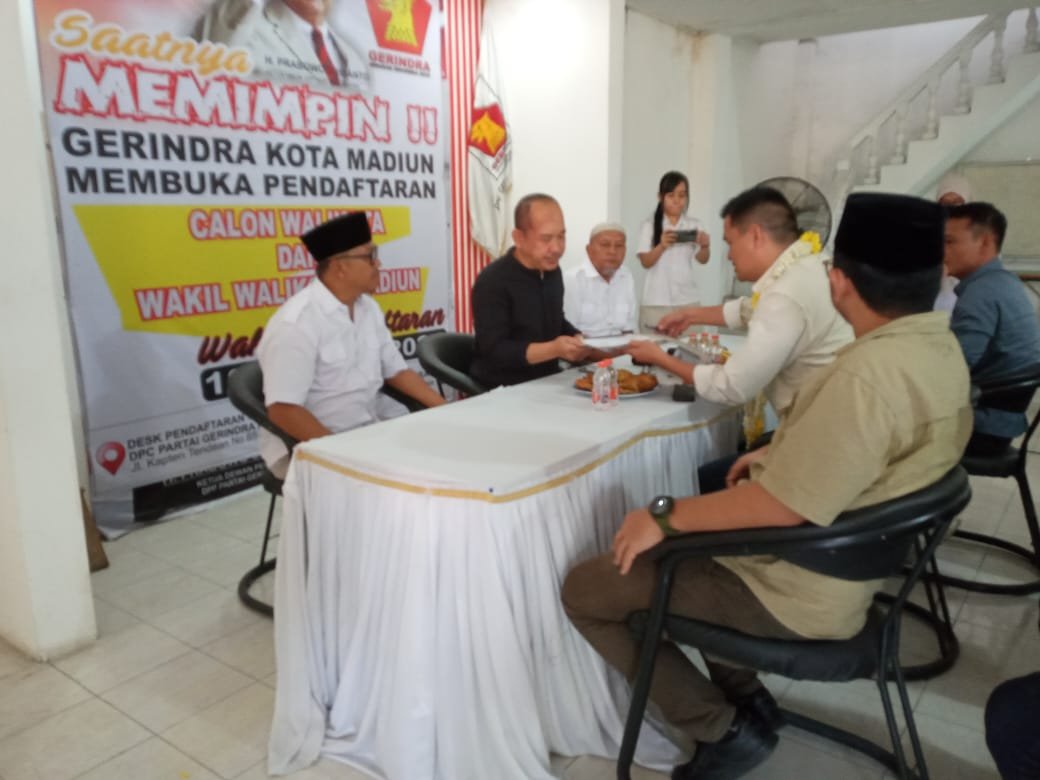 Arema berusia 40 tahun kelahiran Kota Pagar Alam, Sumatera Selatan, itu mengembalikan formulir pendaftaran dirinya sebagai Bacawawali Kota Madiun di DPC Partai Gerindra Kota Madiun, Jl. Kapten Tendean No. 65, Senin (27/5/2024).