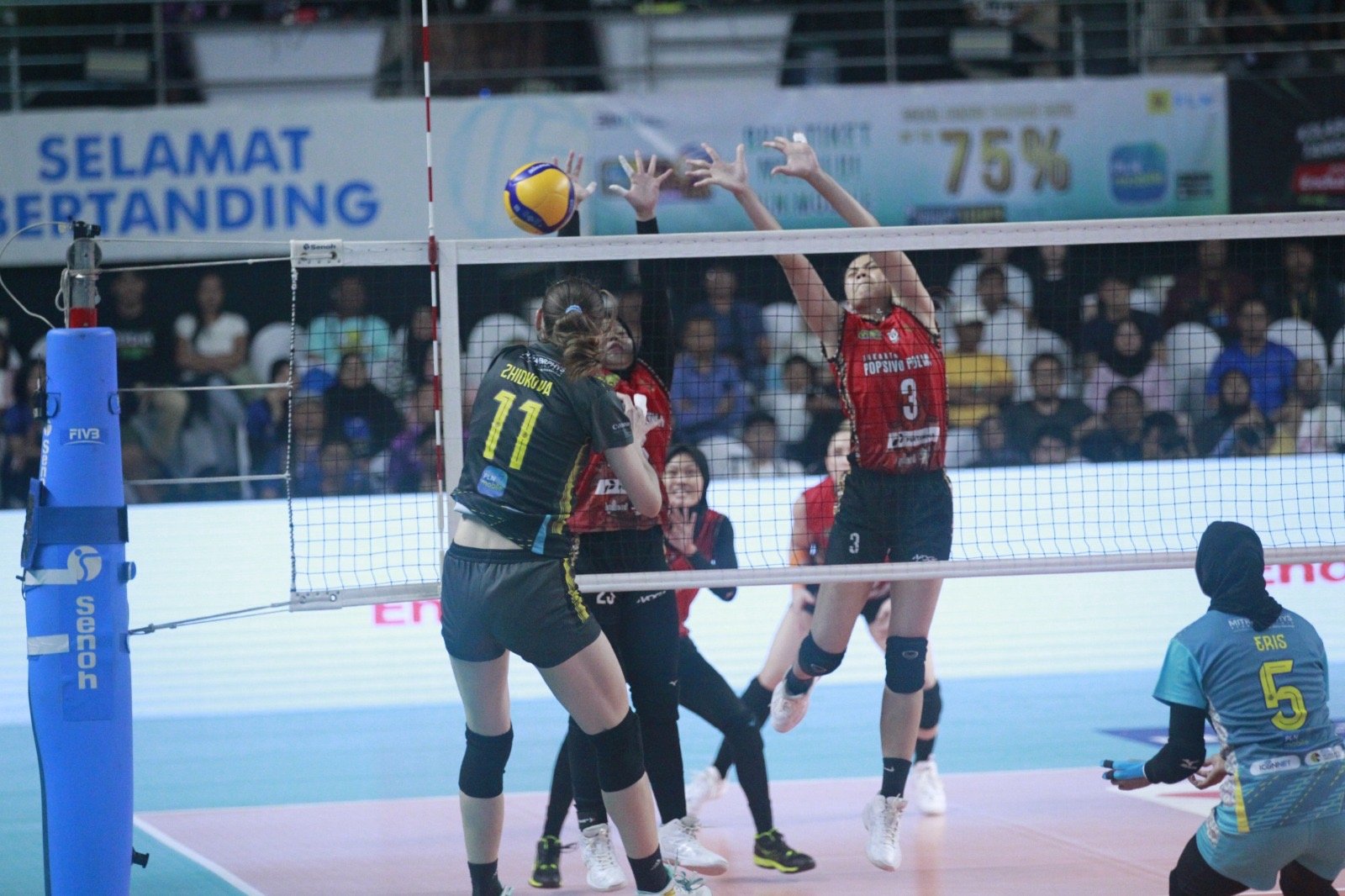 Yolla Yuliana dkk. menumbangkan juara putaran pertama sekaligus pemuncak klasemen sementara, Jakarta Popsivo Polwan dengan skor 3-2 (14-25, 17-25, 26-24, 26-24, 18-16).